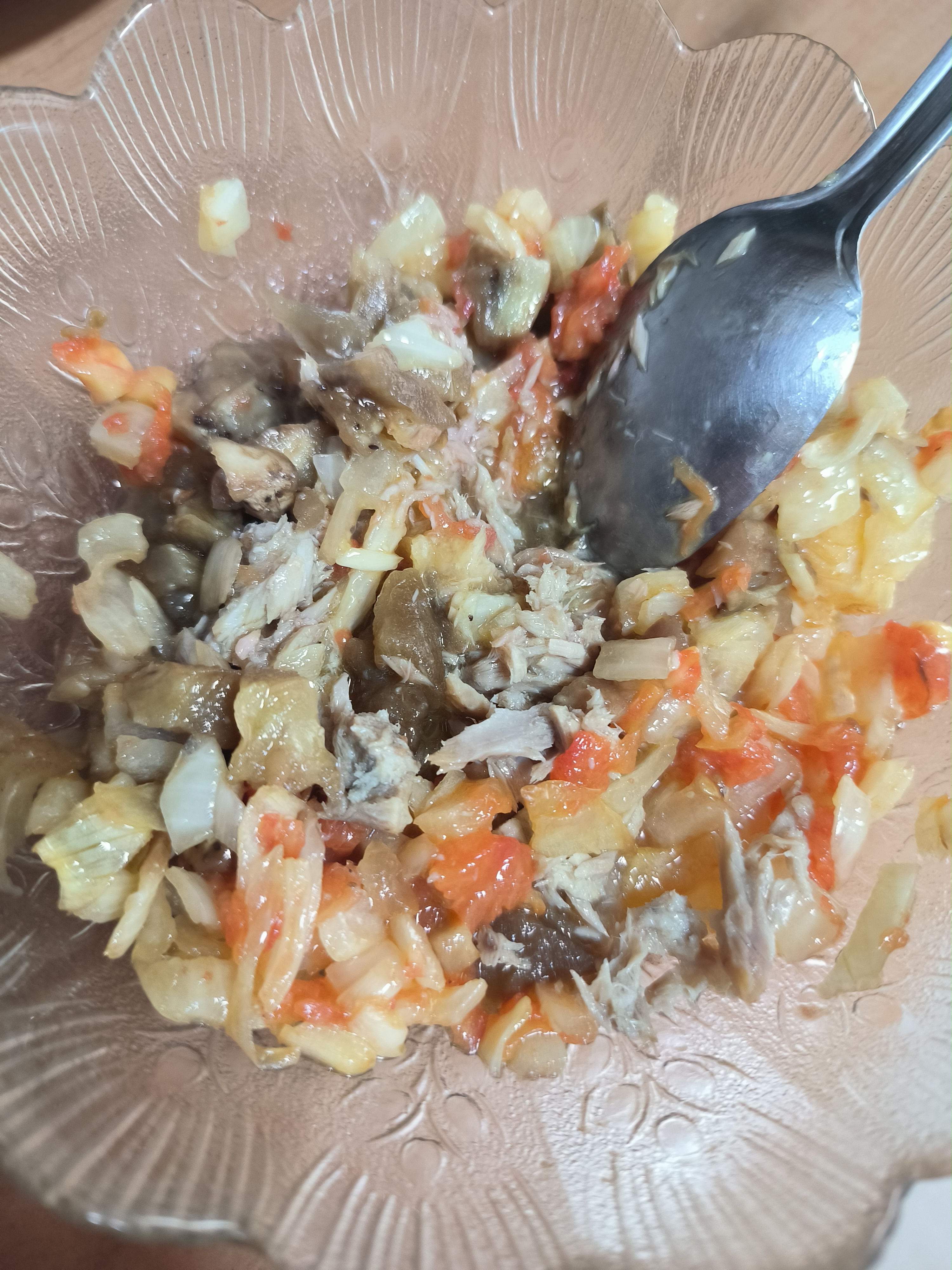 Añadimos la berenjena al sofrito, el atún, comino, sal y pimienta al